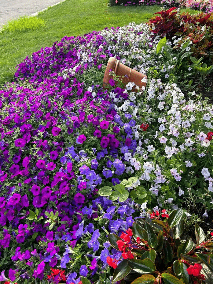 This curbside flower bed creates a dramatic color wave using masses of petunias in purple, violet, and soft white, blended like a gradient across the slope. A tipped terracotta pot becomes a playful focal point, as if the blooms are spilling out and flowing toward the lawn.