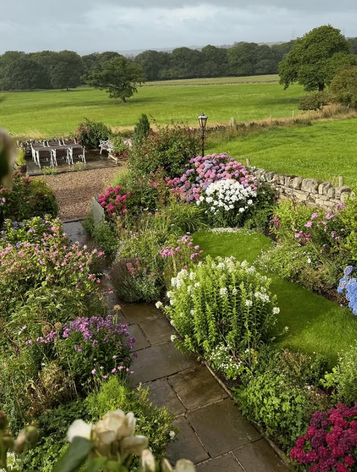 This flower garden blends tidy structure with relaxed country charm, using a clean stone path and clipped lawn shapes to guide the eye toward open fields beyond the wall. Large hydrangea style mounds in pink and white create a strong focal mass, while mixed borders fill the edges with softer purple, green, and seasonal blooms.