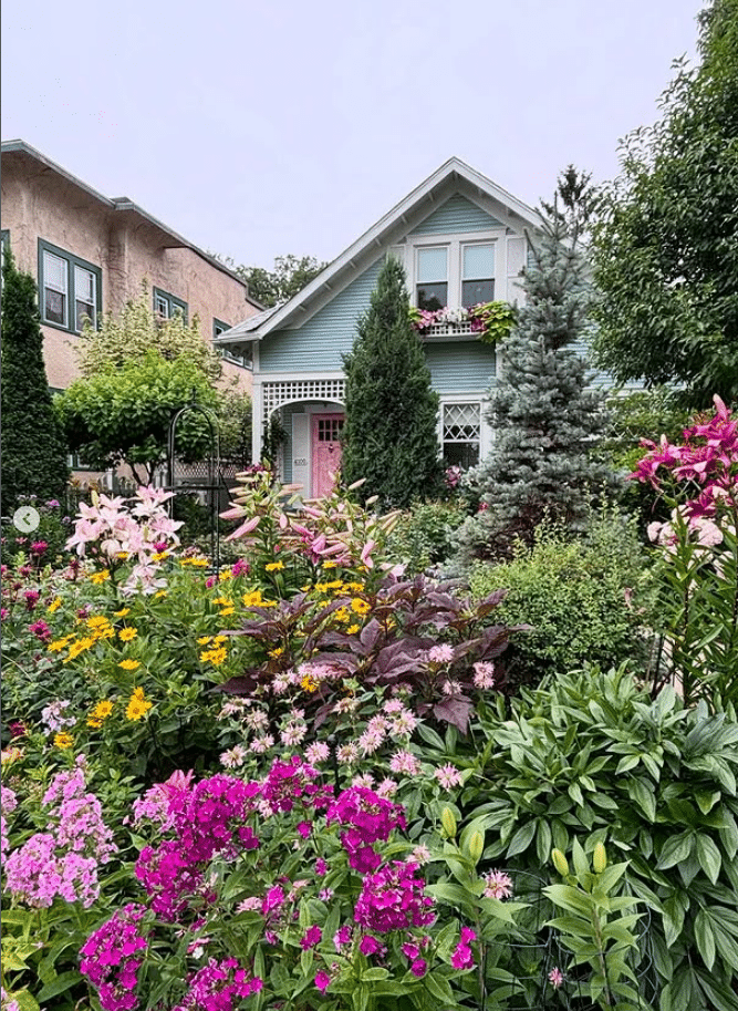 This cheerful cottage flower garden wraps a blue house in bold, layered blooms that make the yard feel welcoming and full of life. Bright phlox like flower clusters, lilies, daisies, and sunny yellow accents mingle with deep green foliage for contrast, while evergreen trees add year round structure.