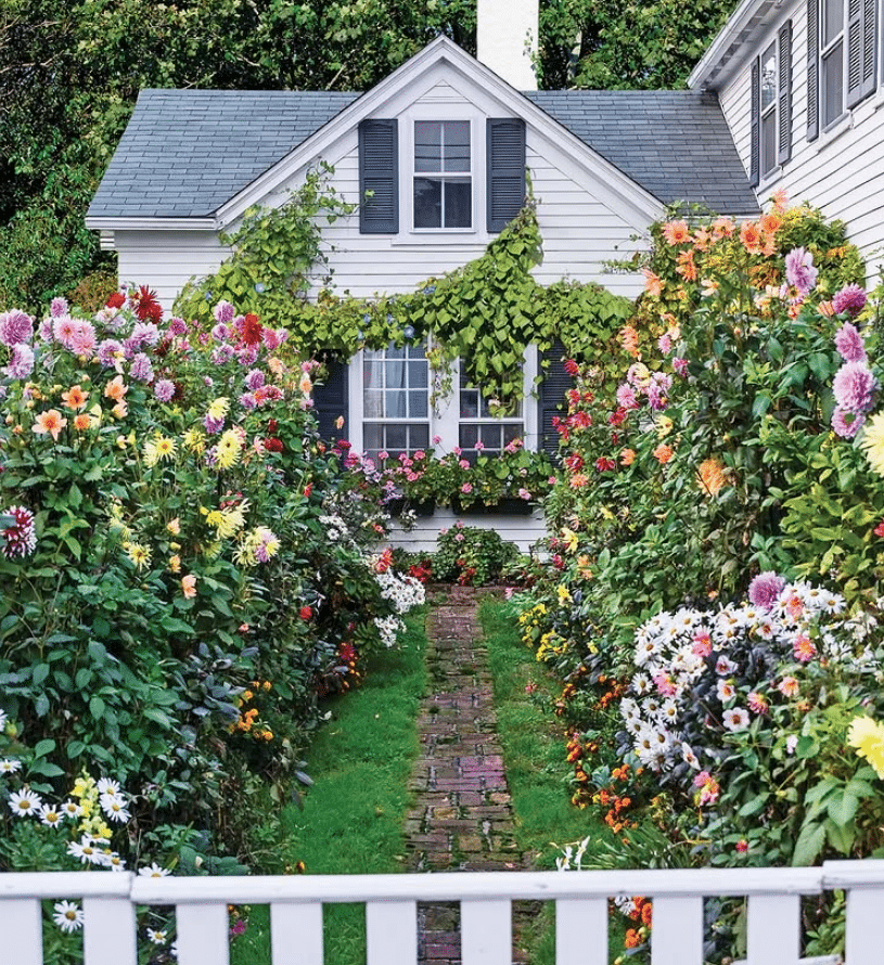 Window vines echo the garden’s lushness, making the home feel wrapped in flowers. The aesthetic comes from mass planting, with large clumps repeated down the length of the path, plus a few white blooms to lighten the palette.