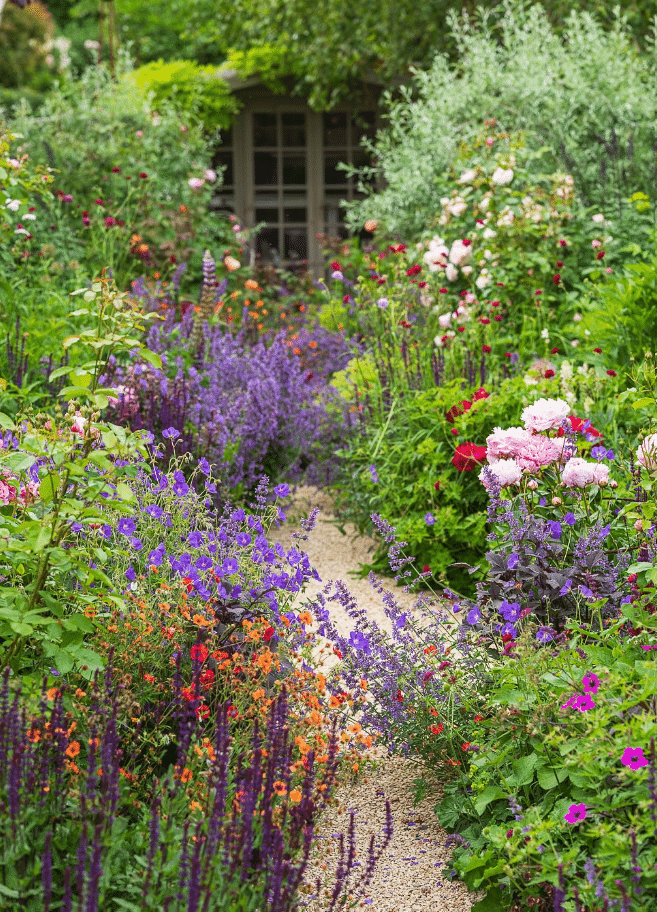 This cottage garden path feels like walking through a living bouquet, with a gravel walkway tucked between overflowing borders. Purple salvia and lavender hues create a soothing base, then pops of peach, pink, and red add warmth and depth.