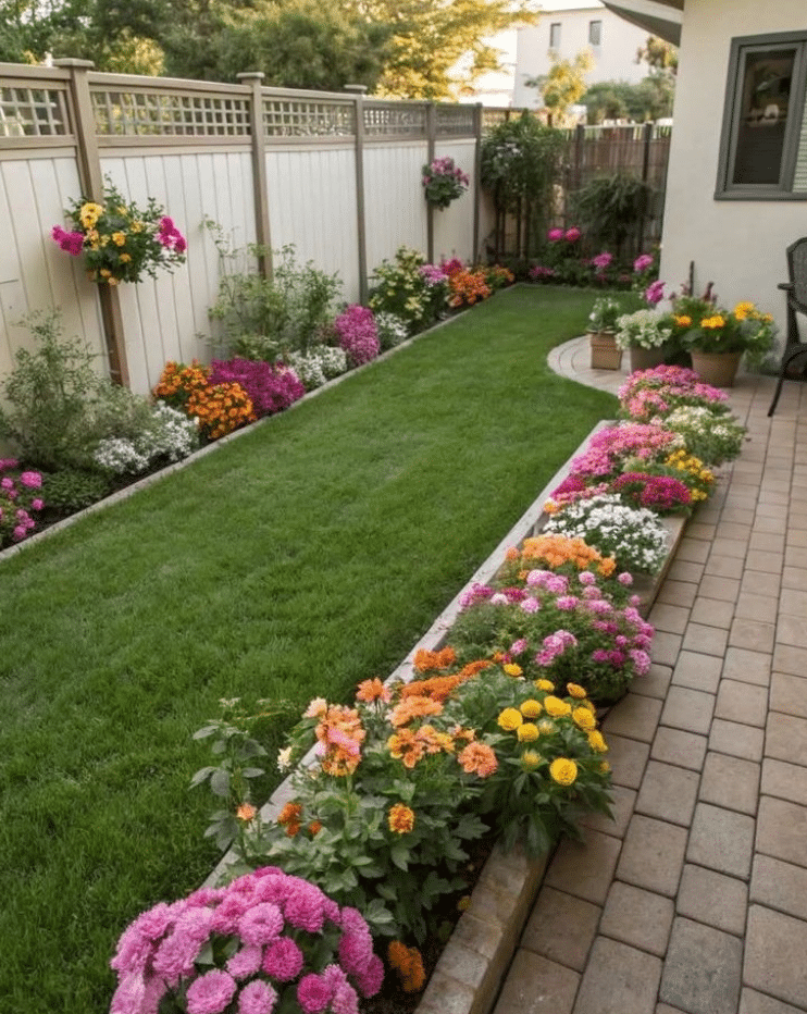 This narrow side yard shows how a long, skinny space can still feel lush and designer. A clean strip of lawn keeps the layout open, while layered flower borders run along the fence and patio edge for nonstop color. Mounded blooms in pink, white, and orange repeat down the bed, creating rhythm and a polished look, and hanging baskets add height without using floor space.