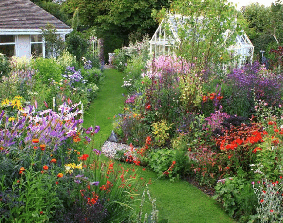 This lush garden creates a magical walk through color, with a bright green path curving between dense, overflowing borders and leading toward a greenhouse. Layers of pink, purple, orange, and red blooms build a cottage garden feel, while taller plants at the back add height and privacy.