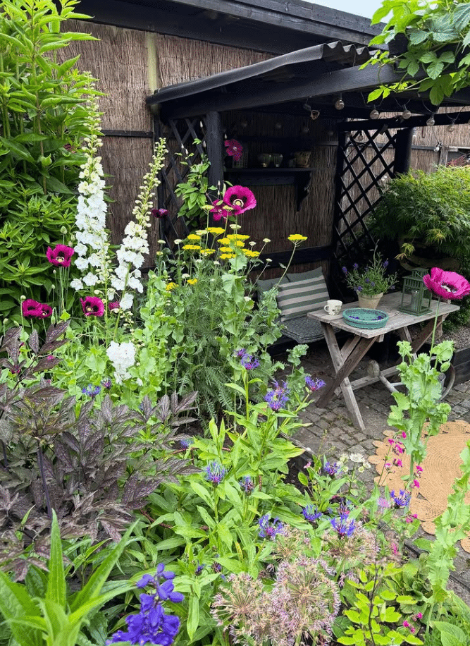 This cozy patio flower garden layers tall white spires, magenta poppies, and sunny yellow accents to create a lush screen around a seating nook. A dark pergola and woven fence add contrast, letting the flowers glow while making the space feel private and sheltered. Mixed foliage, from deep purple leaves to soft green mounds, adds texture and keeps the planting interesting between bloom bursts.