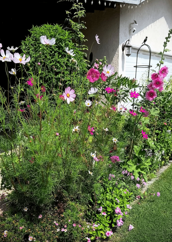 The mix of heights gives the garden depth, with a few standout blooms popping at eye level and smaller flowers carpeting the front. To recreate this look, sow cosmos and companion annuals in drifts, then tuck in sturdier perennials for structure. Add simple edging and let it gently spill throughout summer into fall.