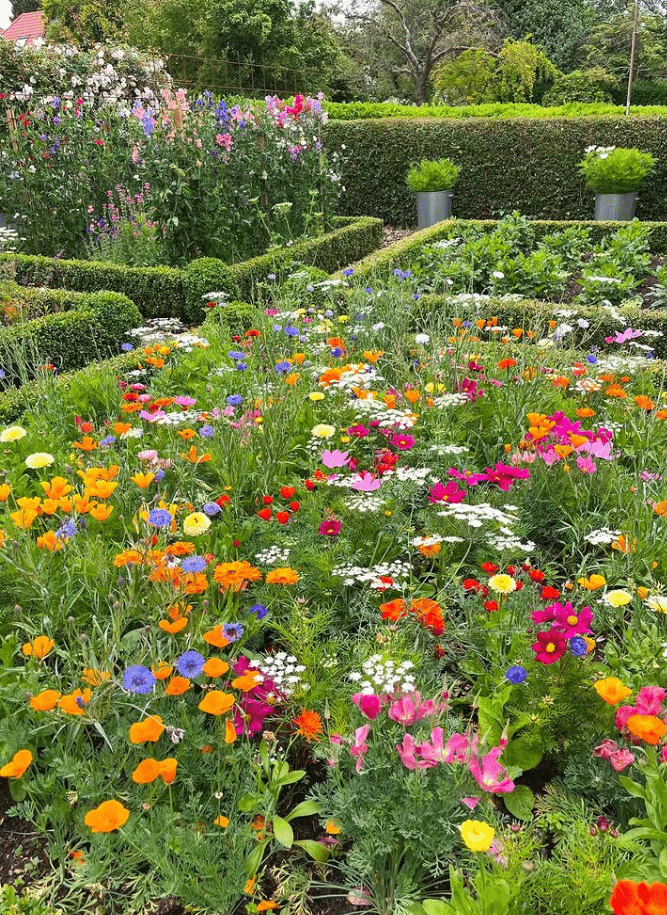 This vibrant garden mixes a wildflower meadow feel with crisp, clipped hedges for a perfect high low aesthetic. Bright poppies, cosmos, cornflowers, and lacy white umbels weave together in a painterly carpet, while boxwood style borders keep everything intentional. The contrast between loose blooms and clean geometry makes the color feel richer and more photogenic.