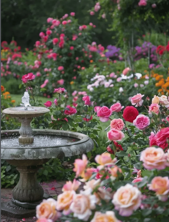 This dreamy flower garden scene centers on a classic stone fountain surrounded by layers of roses in pink, coral, blush, and red. The soft, blurred background of flowering shrubs makes the fountain feel like a secret garden focal point, while the roses up front create a lush, photo worthy frame.