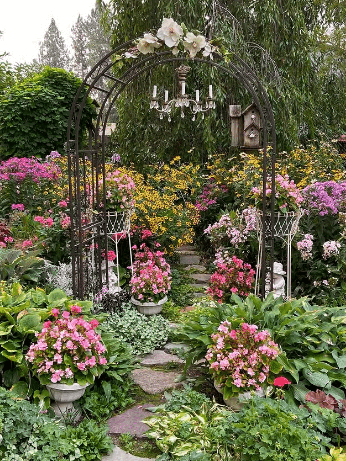 This romantic flower garden arch turns a path into a destination, with a metal arbor framing the view and a chandelier hanging beneath for vintage charm. Large hosta clumps create lush structure at ground level, while pots of pink begonias and trailing greenery soften the edges of the stone walkway. Behind the arch, yellow blooms and pink perennials fill the background, making the space feel deep and immersive.