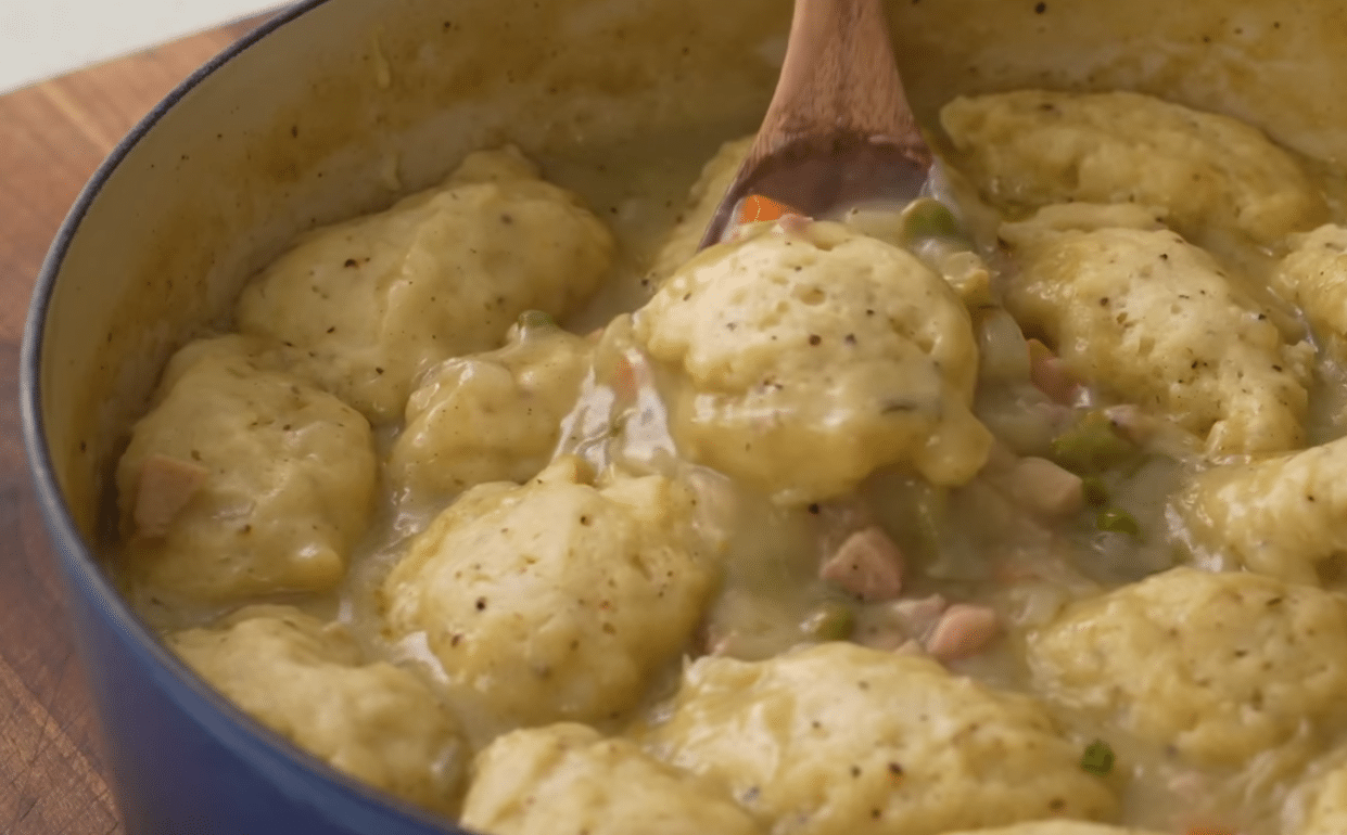 Few dinners are as comforting as a bowl of chicken and dumplings made from scratch, and this old-fashioned recipe delivers everything you expect from the dish. Roasted chicken thighs get shredded into a rich, velvety broth made with butter-sweated vegetables, dry white wine, fresh thyme, and a splash of heavy cream, finished with sweet peas and fluffy, homemade dumplings that steam up light and never gummy.