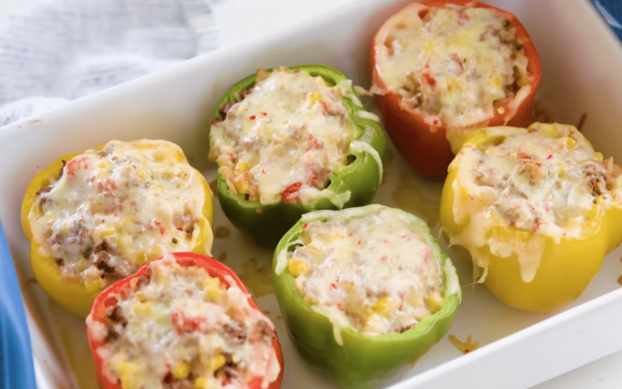 These stuffed bell peppers are one of the most satisfying one-pan dinners you can serve. This recipe shows you how to get them right every time. Colorful bell peppers are filled with hearty ground beef, white rice, corn, diced tomatoes, and Worcestershire sauce, then topped with melty pepper jack cheese and baked until the peppers are tender and the cheese is golden and bubbling.