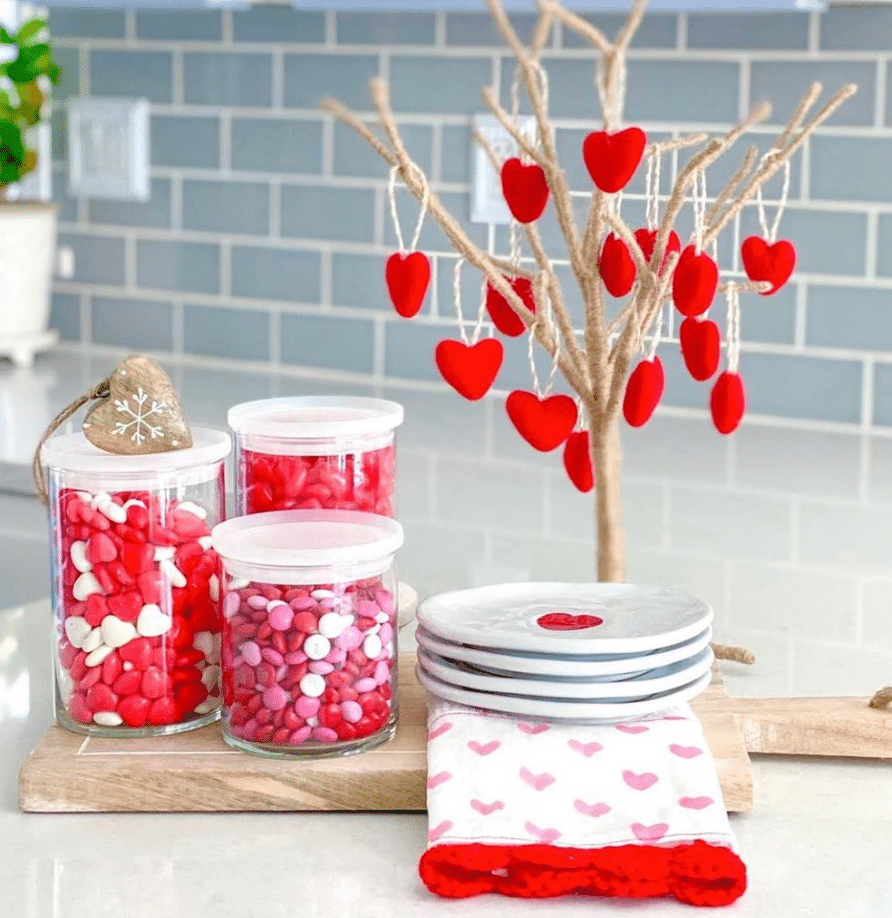 This sweet little setup turns a simple counter into a Valentines treat station. Clear jars overflow with red, pink, and white candy, all lined up on a wooden board. A small twig tree wrapped in twine holds bright red felt hearts. A stack of plates and a heart towel make it practical for everyday snacking. This is an easy idea to copy with grocery store candy and a few jars you already own.