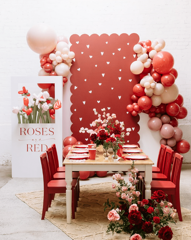 This setup feels like a full event in your own dining room. A scalloped backdrop dotted with tiny hearts sits between lush balloon garlands in red, coral, and blush. A simple wood table holds red chairs, red plates, and overflowing rose arrangements. More roses spill onto the floor and create a runway effect. Use this look for a dramatic Valentines dinner or Galentines party.