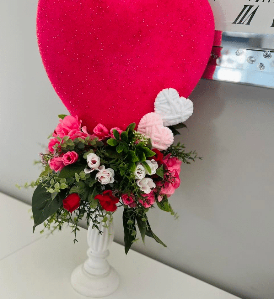 This centerpiece makes a big statement with very little footprint. An oversized glitter heart rises above a lush mix of pink and red roses, greenery, and tiny white blooms. The classic white pedestal keeps the focus on color and shape. Style this on a console, entry table, or sideboard when you want one eye catching Valentines moment.