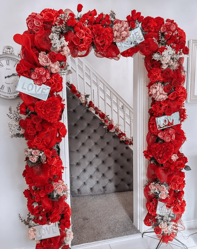 This floral arch turns an everyday doorway into a Valentines statement. Layers of red and blush roses wrap the entire frame, mixed with mesh, greenery, and heart accents. Small love signs peek through the flowers for a playful touch. A coordinating garland on the staircase pulls the whole entry together.