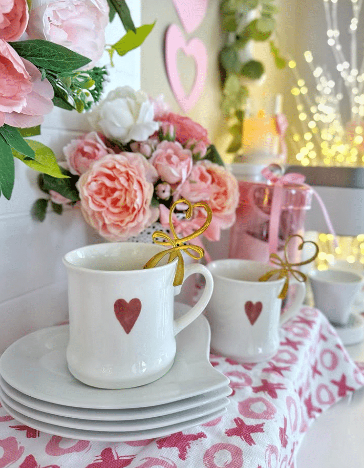 This Valentines drink station feels soft and romantic. White mugs with tiny heart motifs sit on matching saucers, ready for coffee or cocoa. A pink patterned runner, faux peonies, and layered greenery create a lush backdrop. String lights and pastel jars add glow and a bit of sparkle. Set this up on a small sideboard or kitchen counter for an easy Valentines morning ritual.