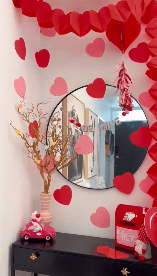 This entry corner leans fully into the fun side of Valentines day. Paper hearts hang from the ceiling and frame a round mirror, while a bold red honeycomb heart anchors the top. On the console, a whimsical Valentines tree sits in a striped vase. A mini red mailbox and tiny car figurine keep the styling lighthearted and kid friendly. The black console grounds all the bright color and stops the space from feeling chaotic. Use this idea near your front door or hallway. Focus on layered garlands, a mirror, and one playful hero piece like the mailbox.