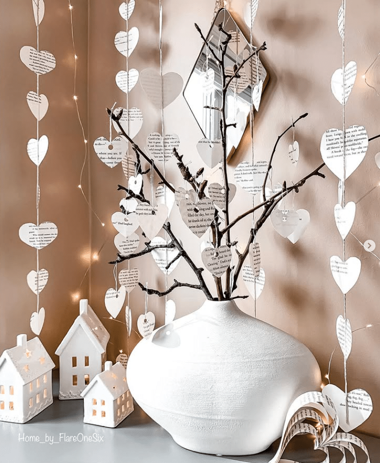 This Valentines vignette proves romantic decor can stay soft and neutral. A sculptural white vase anchors bare winter branches, dressed with delicate book page hearts. String lights and vertical heart garlands fall in the background and add just enough sparkle. Ceramic house lanterns glow at the base and keep the look cozy, not fussy. This idea works beautifully on a sideboard or console table. Use branches from your yard, old book pages or printouts, and a simple white vase to get the same airy, poetic feel.