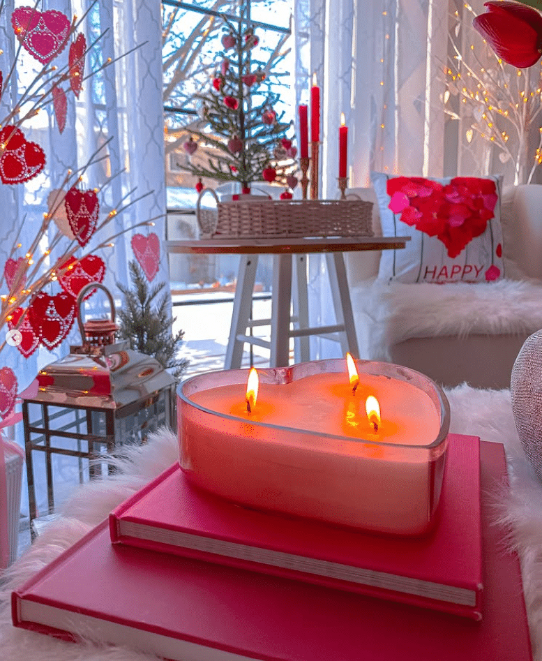 This space feels like pure romance on a winter evening. A heart shaped candle glows on top of bright pink books. In the background, twinkle lights, heart branches, and red candles fill the room with soft color. Use this idea on a side table or ottoman for instant ambience.