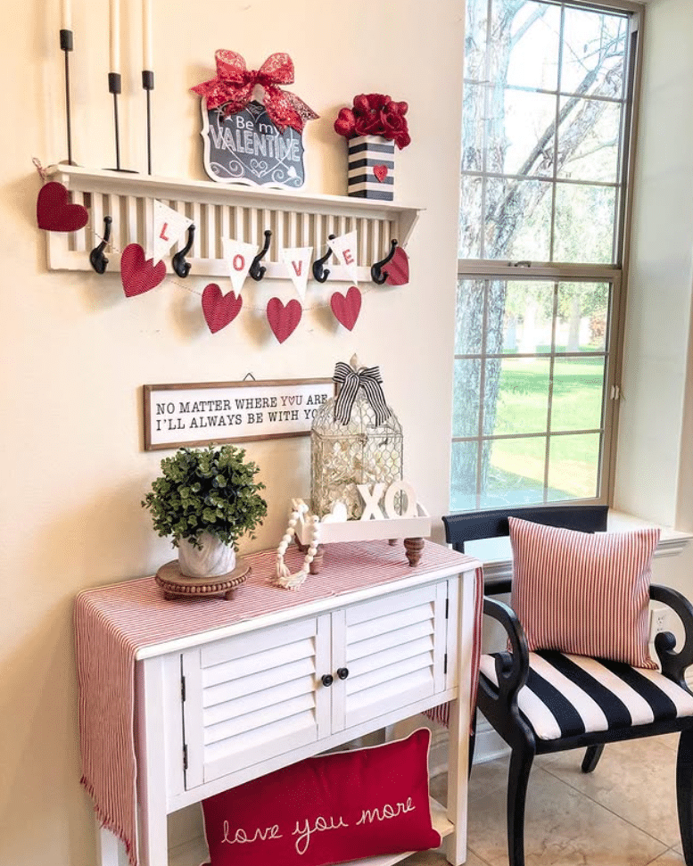 Here, a simple white console becomes a sweet Valentines moment with just a few thoughtful layers. A striped runner sets the palette of red and white. Above, a peg rail holds a chalkboard style sign, bow topped decor and a mix of vases and florals. A heart and letter banner spells out love and draws the eye across. On the console, greenery, beads and an XO sign add texture. A red lumbar pillow that reads love you more finishes the scene. This is an easy idea to copy with a console table, peg rack and a few coordinated accents.