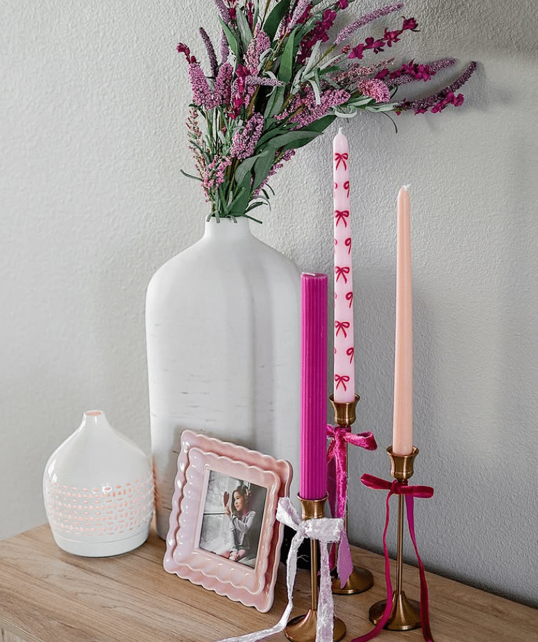 This vignette feels romantic but calm. A tall white vase holds deep pink stems for height and color. Three slim candles in brass holders bring warmth, each tied with velvet ribbon for a pretty detail. A scalloped pink frame and simple ceramic diffuser keep the look sweet and personal.
