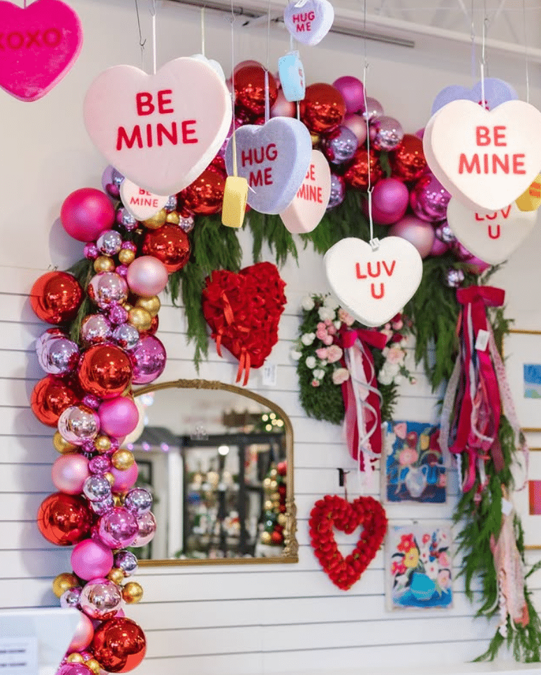 This setup is all about fun and color. Oversized conversation hearts hang from the ceiling and fill the space with playful messages. Below, a shiny garland of pink, red, and gold ornaments curves around greenery and ribbons. It makes a bold backdrop for a shop display, party entrance, or photo wall.