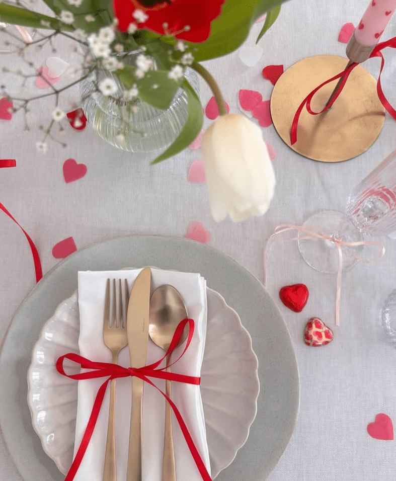 This table proves you do not need much to feel special. A scalloped plate and stoneware charger create a soft base. Gold flatware sits on a crisp white napkin, tied with a simple red ribbon. Heart confetti, flowers, and slender candles scatter across the tablecloth. Use this look for a low stress dinner at home, date night, or a Galentines brunch.