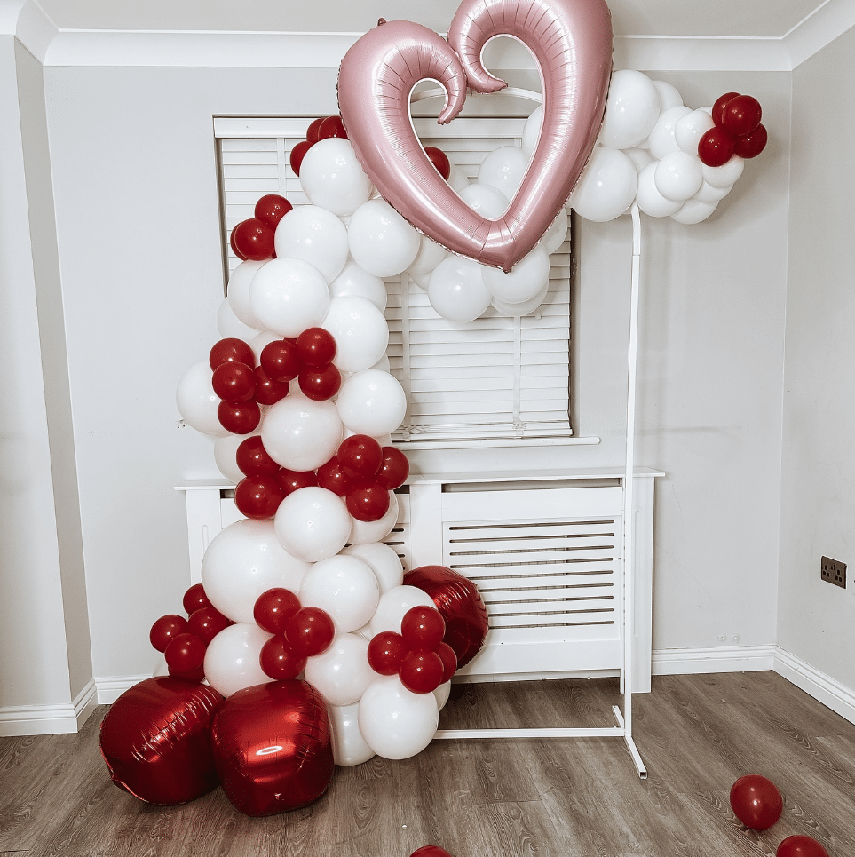 This balloon display proves minimal can still feel special. Clusters of white and red balloons climb a simple frame and spill to the floor. A large metallic heart balloon sits at the top and acts as the focal point. Set this backdrop behind a dessert table or photo spot.
