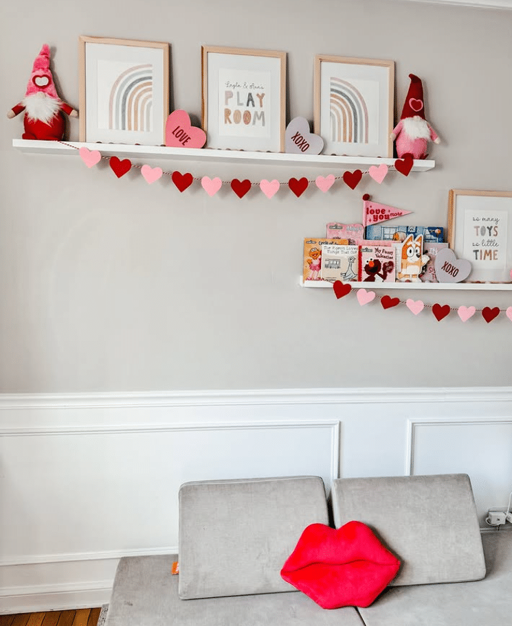 This playroom wall mixes Valentines decor with everyday function. Simple white picture ledges hold rainbow prints, framed art, and favorite kids books. Heart garlands drape under each shelf and tie the red and pink palette together. Little gnomes and conversation heart signs add a playful touch. The neutral sofa and bold lip pillow keep the room cozy and ready for reading or movie nights.