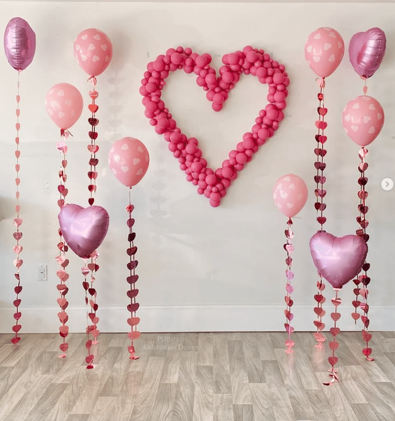 This balloon wall feels like instant party magic. A giant heart made from mini pink balloons becomes the main backdrop. Helium balloons flank the sides, each anchored with cascading heart garlands. The clean white wall and light floors keep the look fresh and modern. Use this idea for a Valentines photo booth, dessert table, or kids party corner.