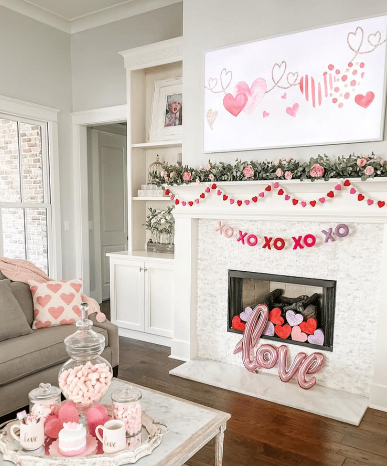 This living room proves you can keep Valentines decor sweet and airy. A leafy garland and pink roses line the mantel, with a felt ball garland and XO banner adding playful color. The fireplace holds layered heart cutouts and a balloon love sign. On the coffee table, jars of pink candy and mini mugs finish the look. It feels festive yet still calm for everyday living.