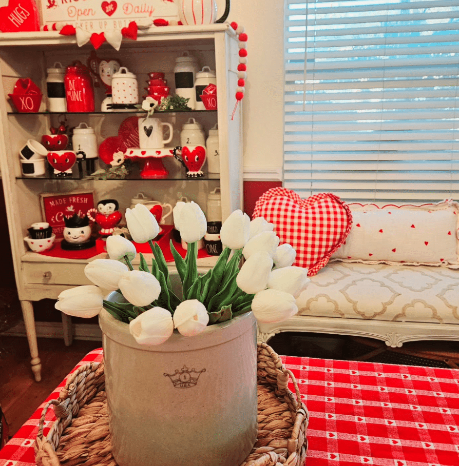 This cozy nook leans into diner inspired charm. A checked red tablecloth and woven tray frame a crock of white tulips. In the background, a vintage style hutch overflows with red and white mugs, canisters, heart plates, and seasonal signs. A bench with gingham and heart pillows invites you to sit and sip coffee. This is a great idea for anyone who loves nostalgic Valentines decor.