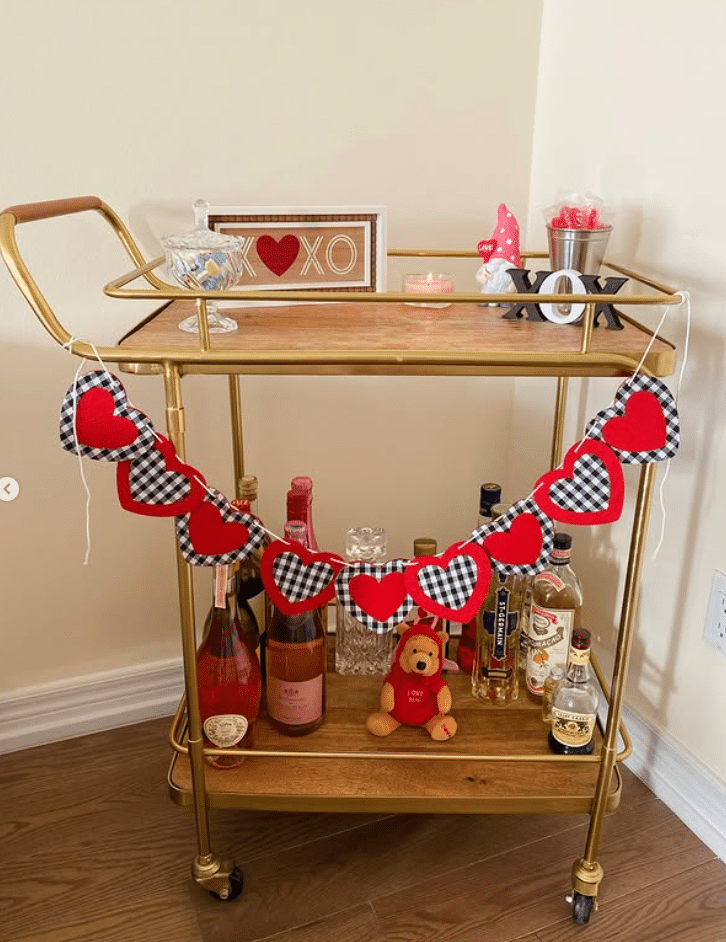 This gold bar cart turns into a little Valentines party corner. A bold heart garland in red and black gingham steals the show. Bottles, glassware, and a tiny teddy bear fill the lower shelf. On top, an XO sign, candle, and candy bowl finish the look without clutter.