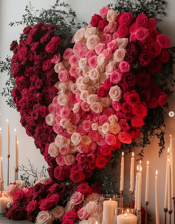 This floral installation is pure romance. Hundreds of roses form a giant heart, shaded from deep burgundy through hot pink to the palest blush. Loose greenery softens the edges and keeps the heart from feeling too stiff. Below, rows of taper candles and pillar candles glow at different heights, casting warm light over the petals. The result feels like a luxury hotel lobby or event space, yet you can borrow the concept at home on a smaller scale. Use foam boards, faux roses and a heart outline, then add clusters of candles to create a stunning Valentines focal wall.